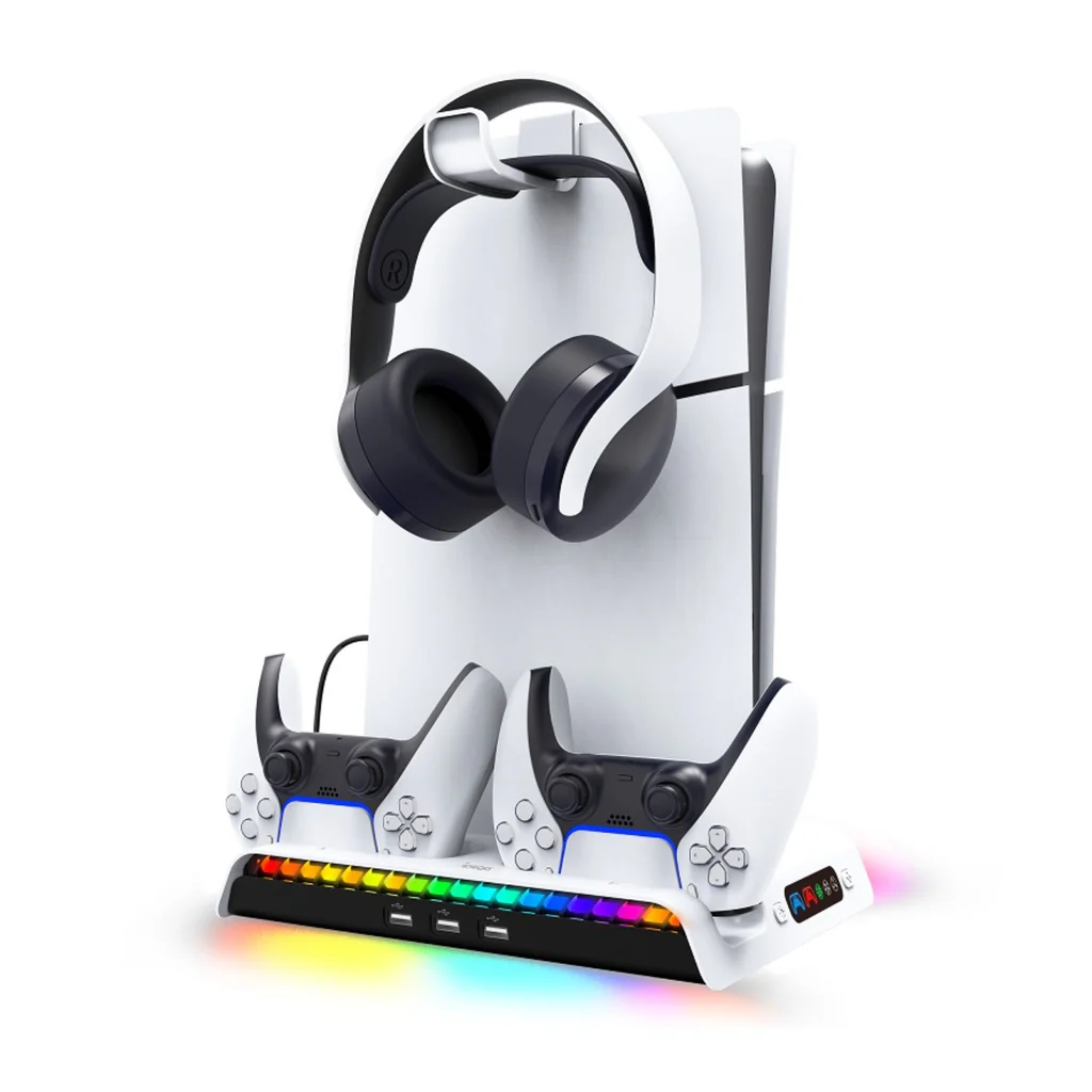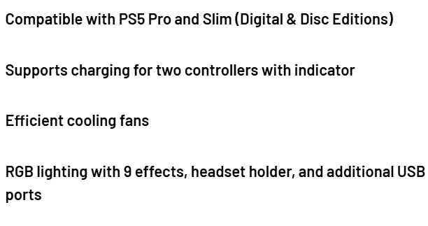 | Features | Cooling Fan, Headset Stand, RGB lights, x2 Dualsense Controller Charging Dock |