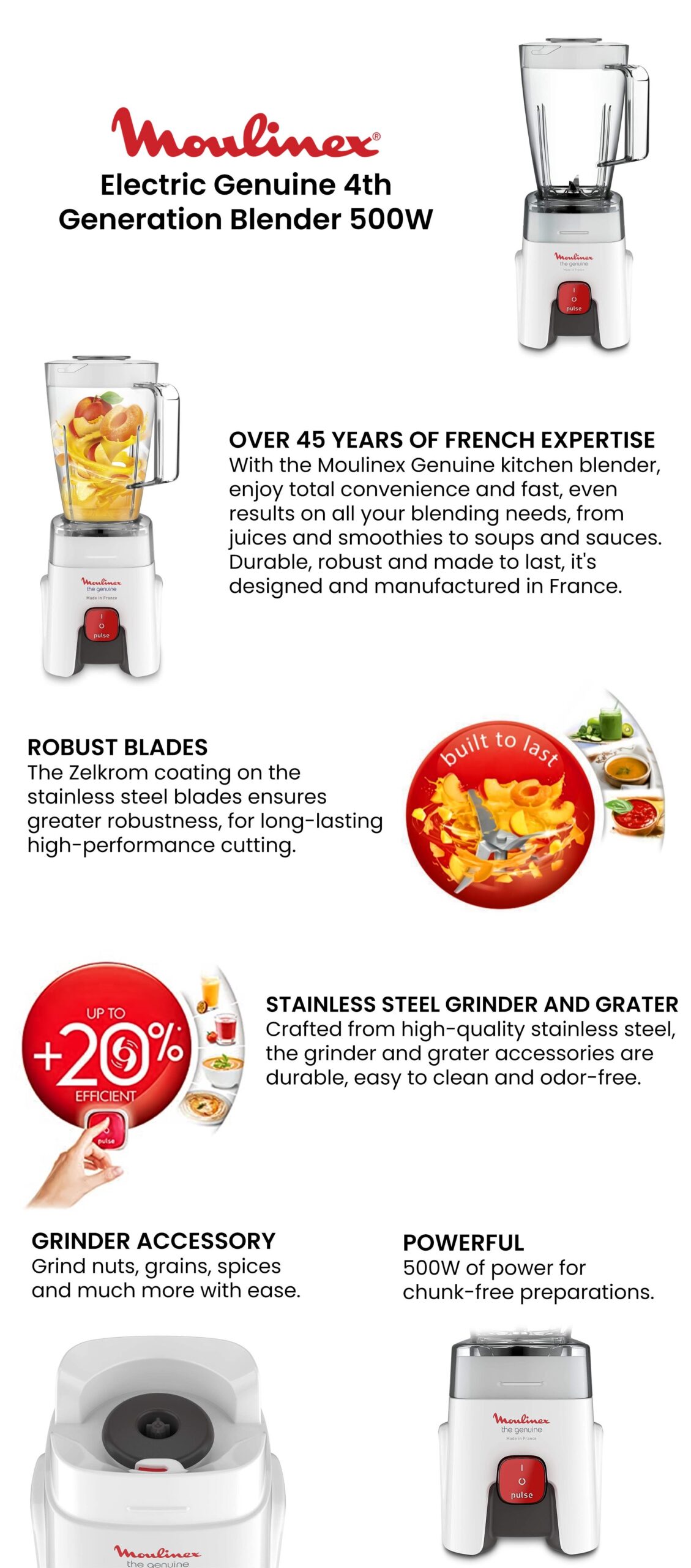 - High performance: 500 W of power for chunk-free preparations
